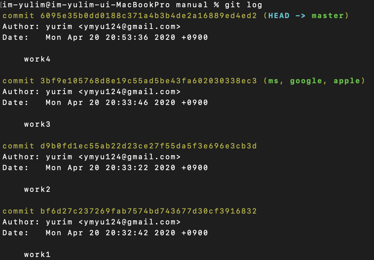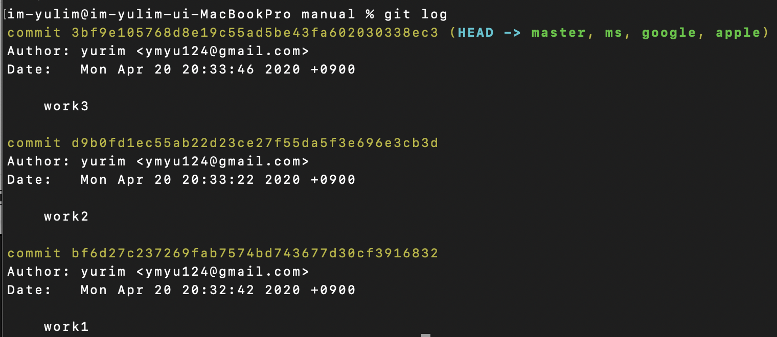 $git log 브랜치이름1..브랜치이름2 -> 브랜치이름2에만 있는 commit 보여줌