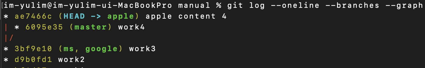 $git log --oneline --branches ->각 브랜치별 최신 commit 보기