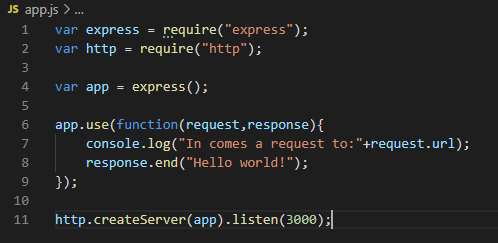 5. 터미널에 $node app.js 입력하고 localhose:3000으로 들어가보면 서버가 실행되는 것을 볼 수 있다.